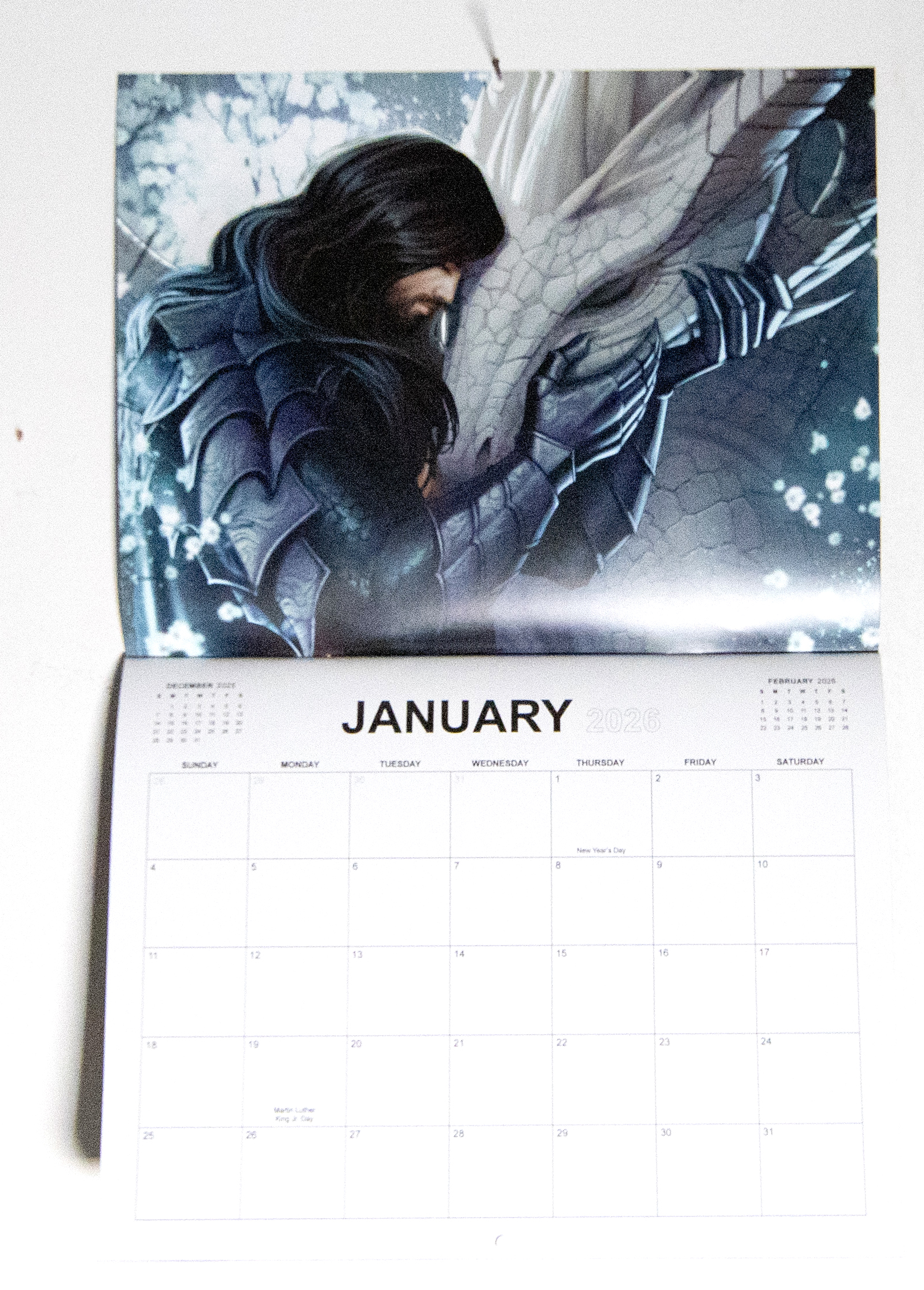 So we bring you the mixed art wall calendar of Raythe Reign for 2026! We have only printed 50 of them because we weren’t sure of the demand. They will start shipping in December. On the off chance of selling through all 50 calendars, we might be able to order more in time, but no promises. Our printer has said this is a very busy time.